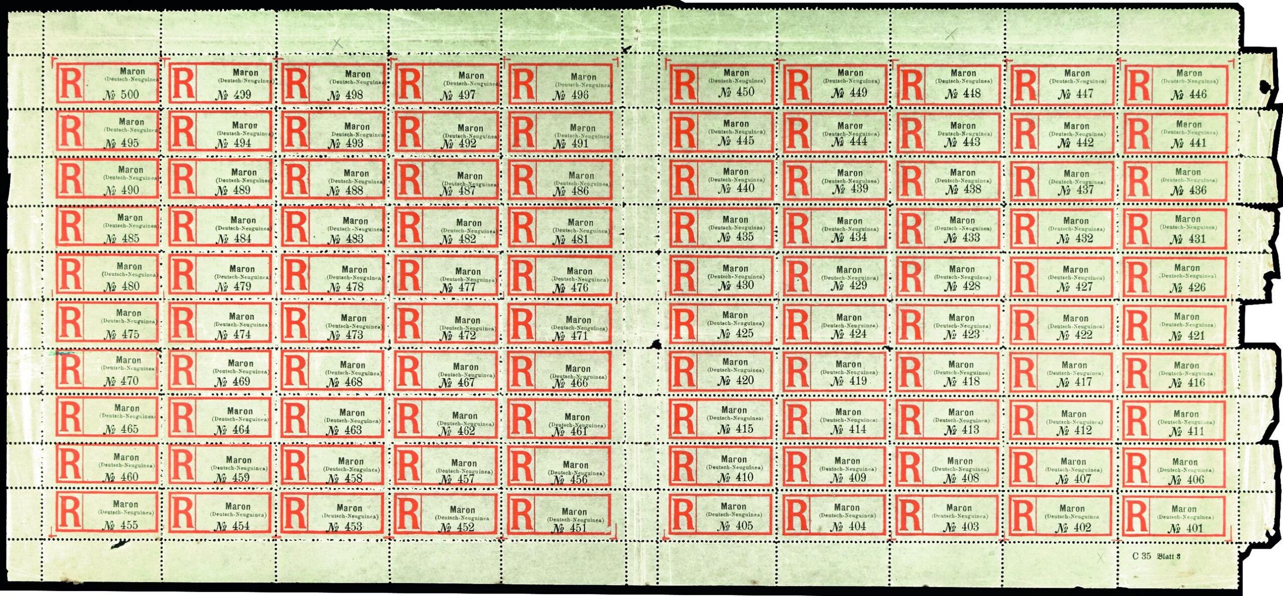 Aus den Deutschen Kolonien werden gesuchte Standardwerte aber auch rare Besonderheiten angeboten. So eindrucksvoll wie selten ist ein kompletter Bogen der R-Zettel von Maron, einer kleinen und kurzlebigen Postanstalt in Deutsch-Neuguinea, die lediglich von 1910 bis 1914 bestand. Die 3. e@uction bietet die höchstwahrscheinlich einmalige Gelegenheit, einen kompletten 100er-Bogen eines Einschreibezettels aus den Kolonien zu erwerben. Das Startgebot liegt bei 1.000.- Euro. Wer den berühmten „Blick über den Tellerrand“ wagt, findet ein interessantes Angebot der in überaus kleinen Auflagen gefertigten Marken der Ozeanreederei sowie entsprechender Belege; darunter der 15- und 50 Mark-Wert (MiNr. 11Y und 14Y) je mit Wasserzeichen Y (fallend) in tadelloser, postfrischer Erhaltung. Die Auflagen der Marken betrugen je nur 500 Stück, darunter nur sehr wenige Exemplare mit dem Wz. Y. Die Startpreise liegen entsprechend bei 10.000.- Euro. Darüber hinaus bietet die 3. e@uction mehr als 800 Lose mit zahlreichen Farbvarianten, Typen und einem umfangreichen Angebot für den versierten Stempelsammler.